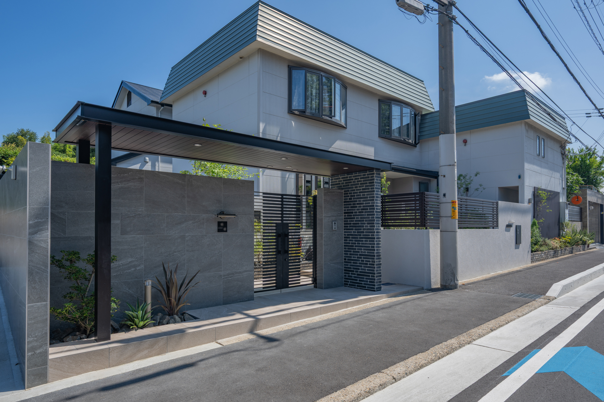 大判のグレー系タイルをあしらった門柱と塀を設け、住まい全体に落ち着きと高級感をプラス。