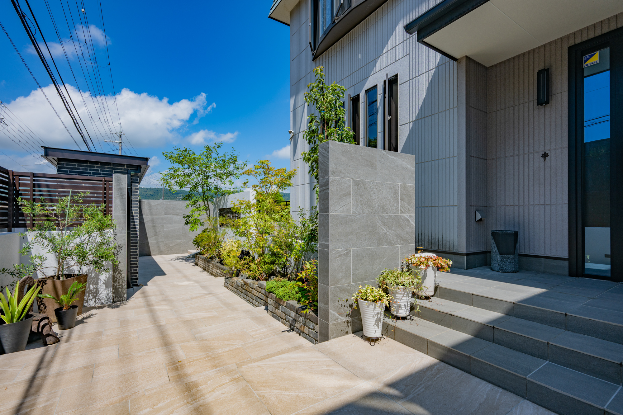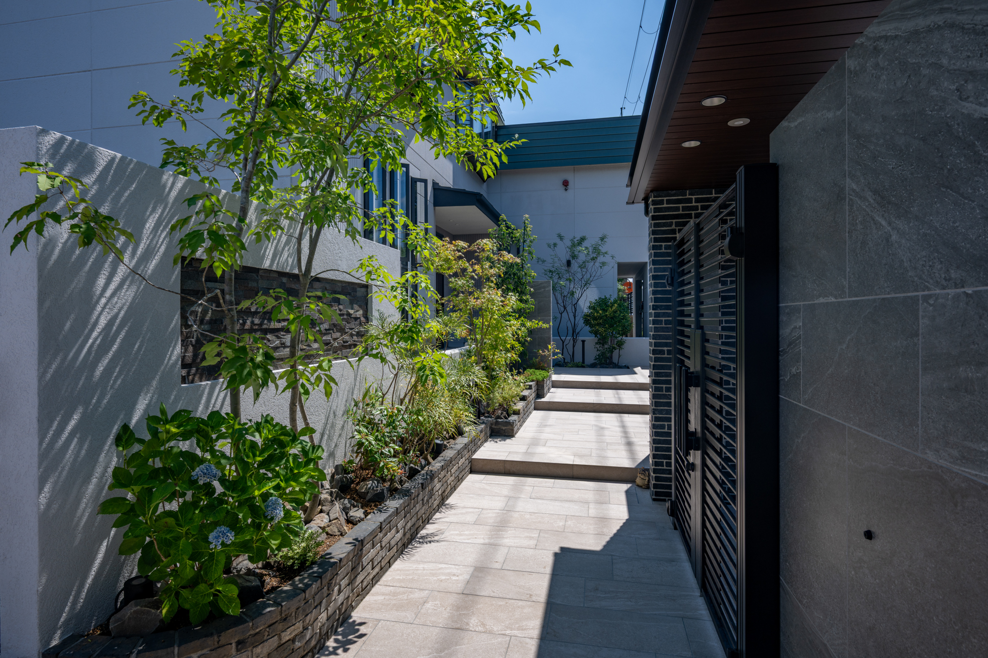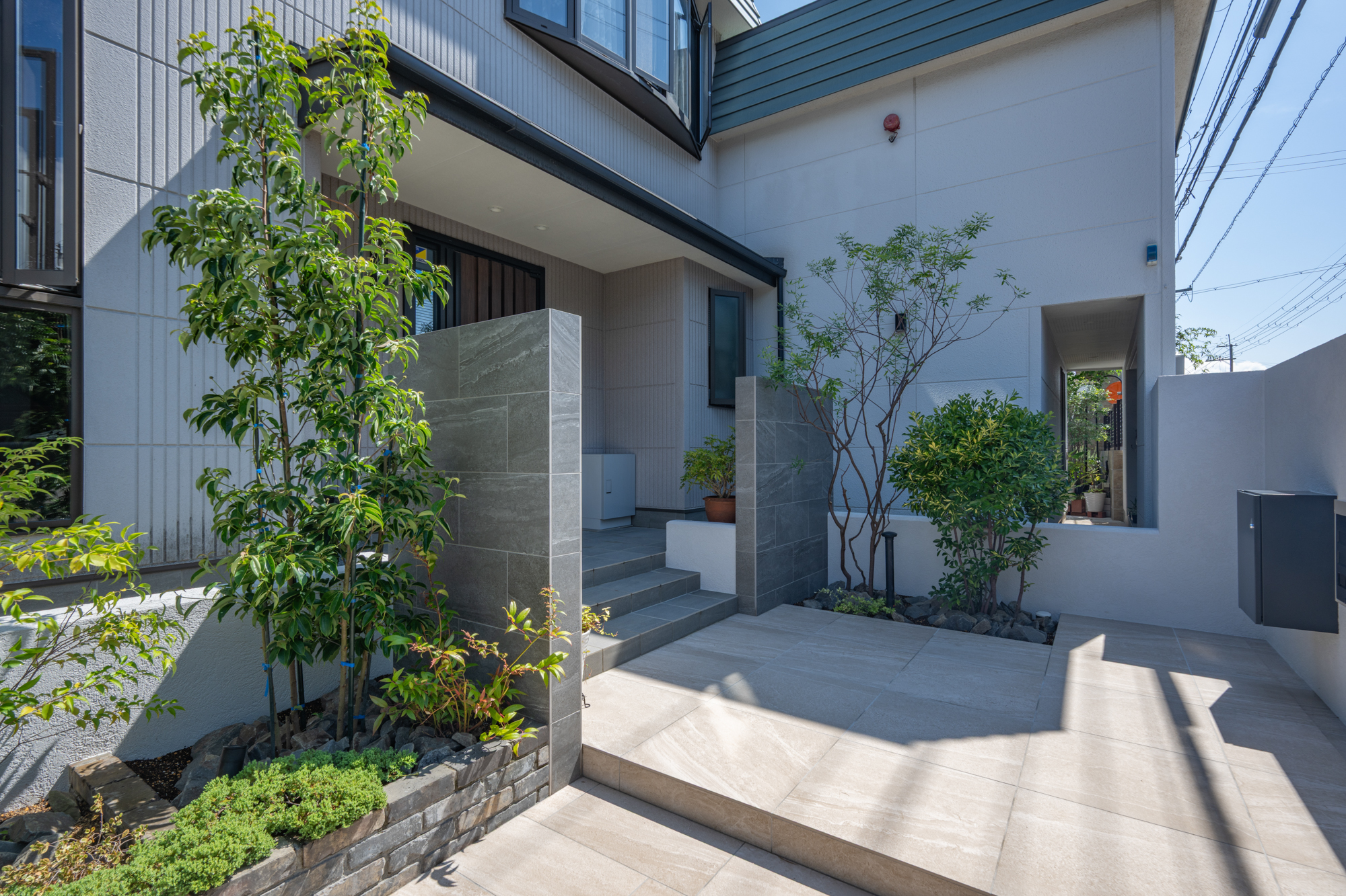 植栽をバランスよく配置することで、視線をやわらかく遮りながら季節の変化も感じられるアプローチとなっています。
