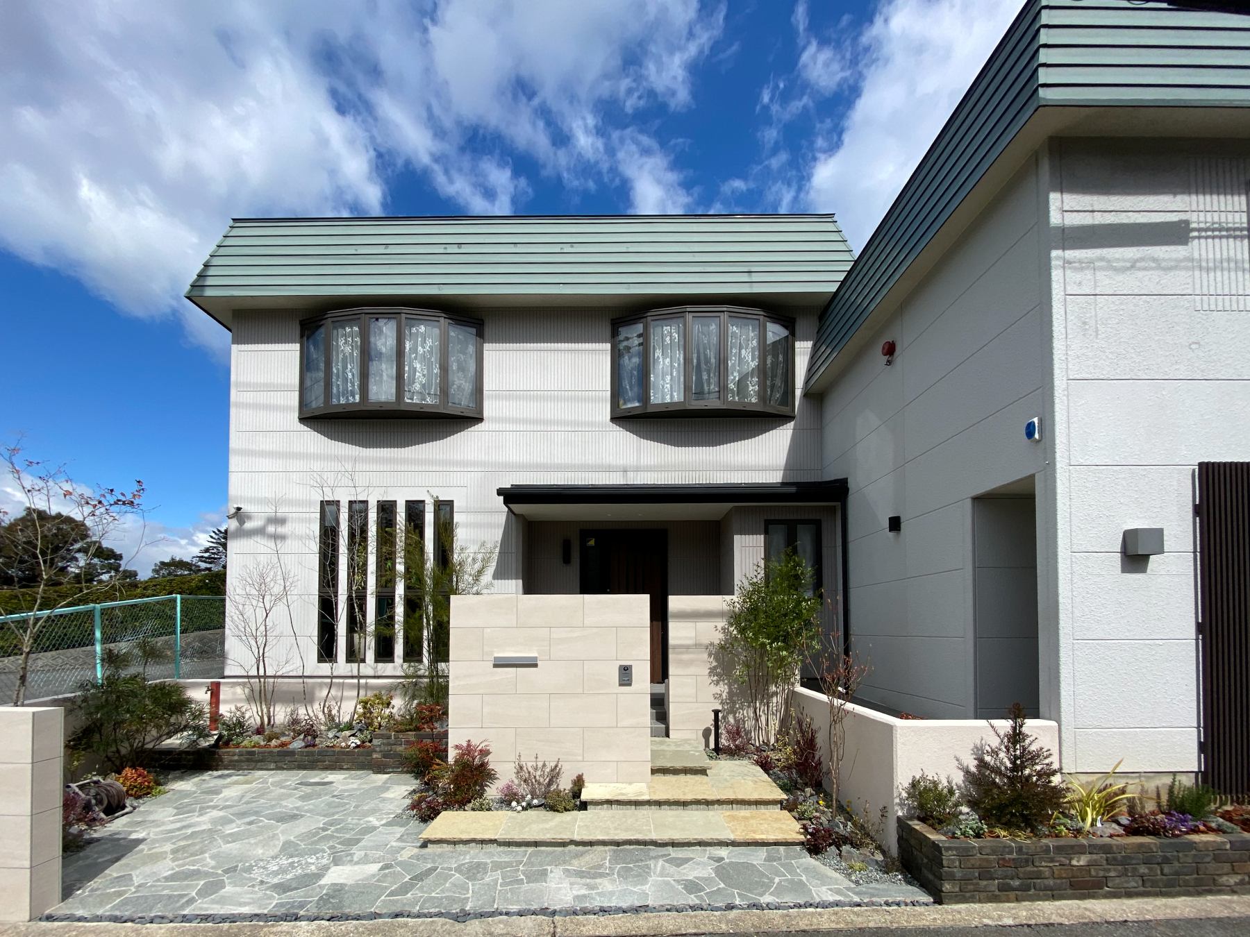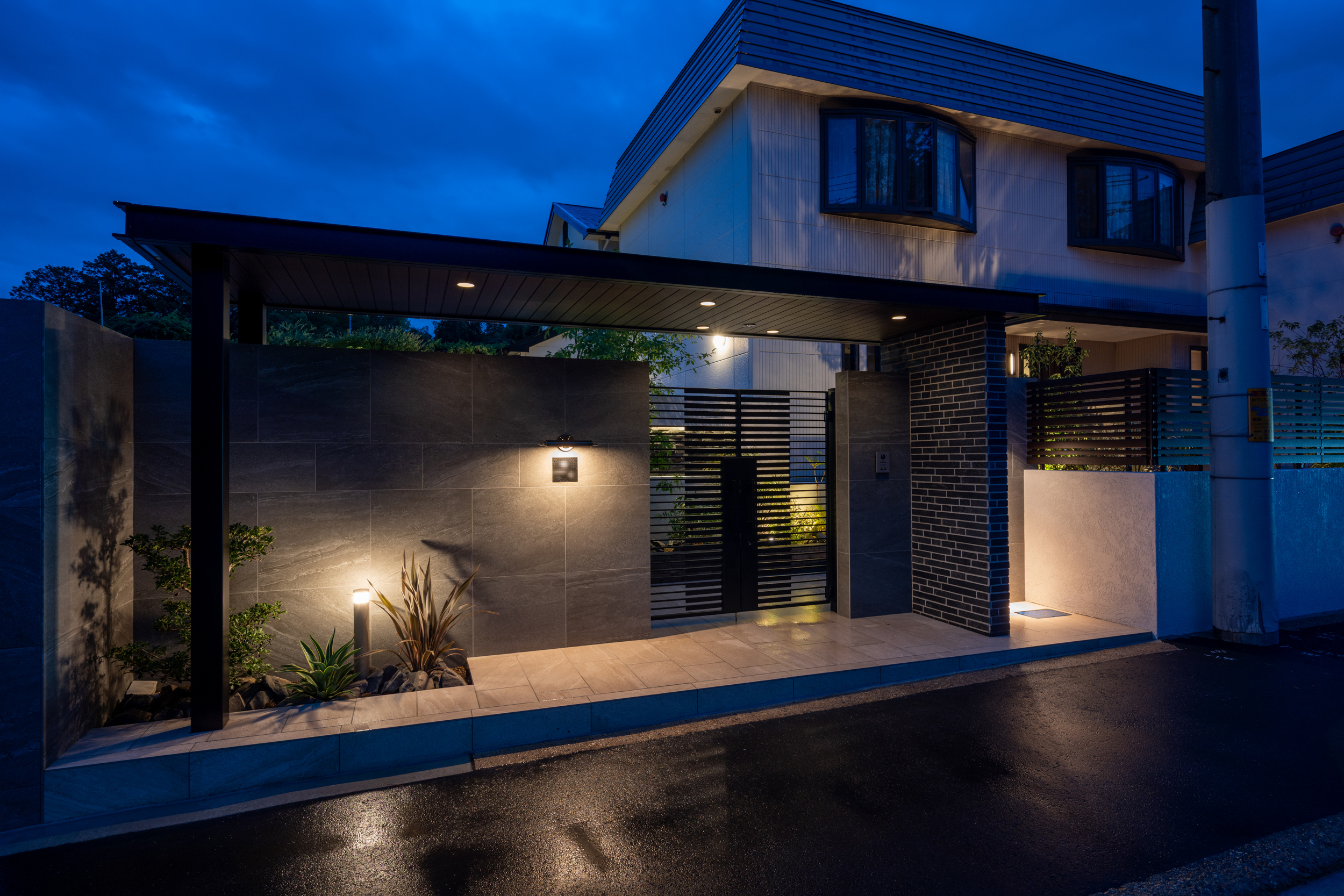 昼間は、大判タイルの門柱や直線的なフレーム、植栽のグリーンがはっきりと映え、素材の色合いやデザインそのものの美しさが際立ちます。自然光のもとでは空間全体が明るく開放的に感じられ、住まいの存在感と端正なファサードラインを楽しめるのが魅力です🌿