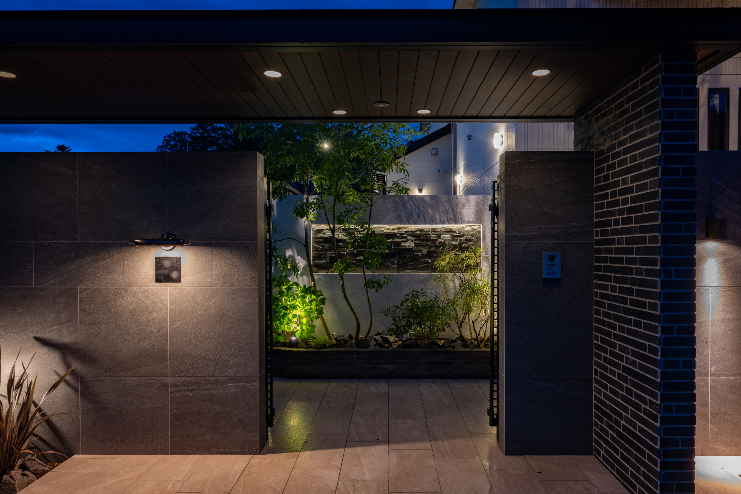 エントランスの正面には質感豊かな石張りのアクセントウォールを配置し、視線を自然と奥へと導く設計に。ライトアップされた石の陰影が空間に奥行きと高級感をもたらし、上質で印象的な迎えのシーンを演出しています。