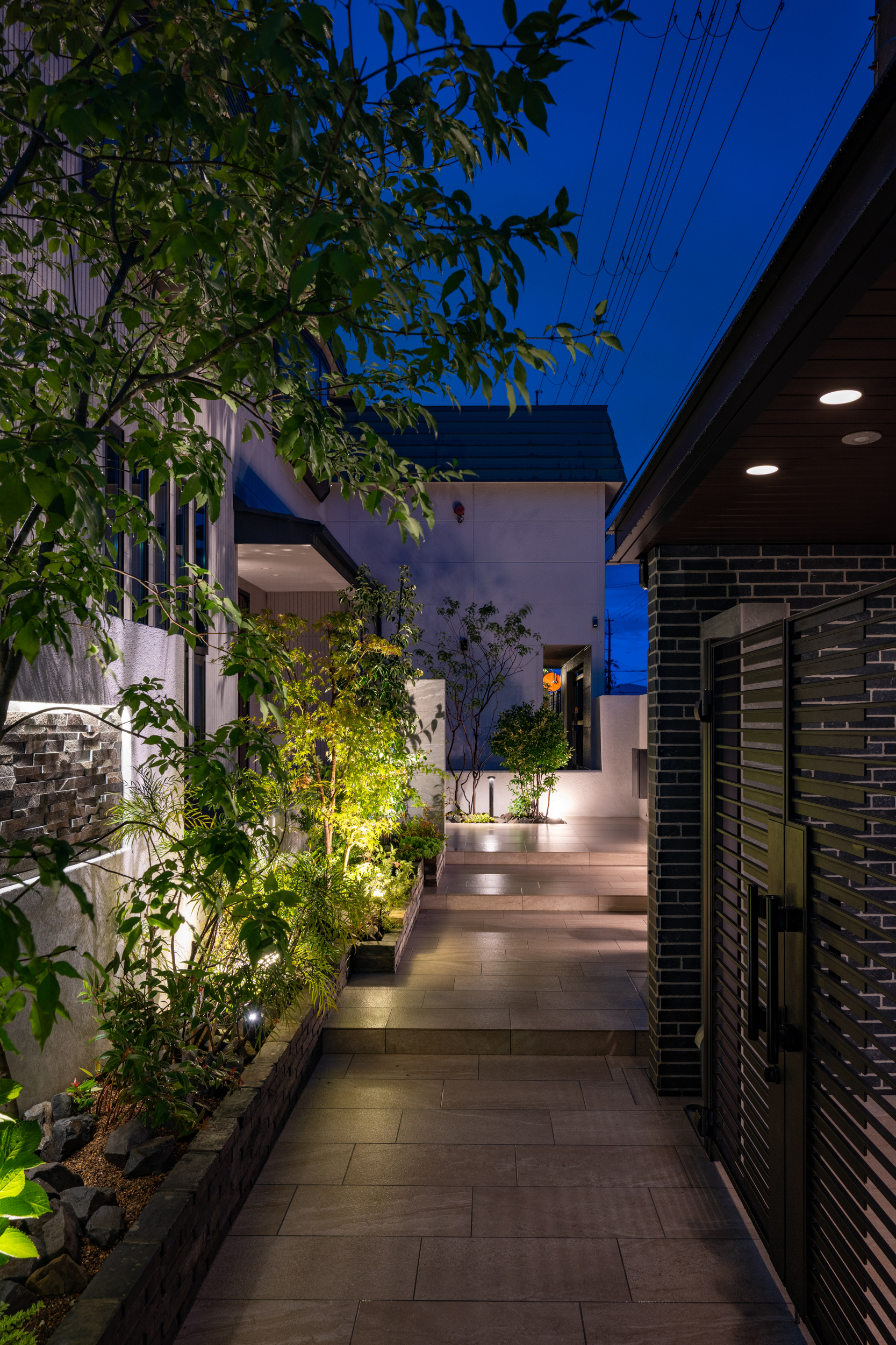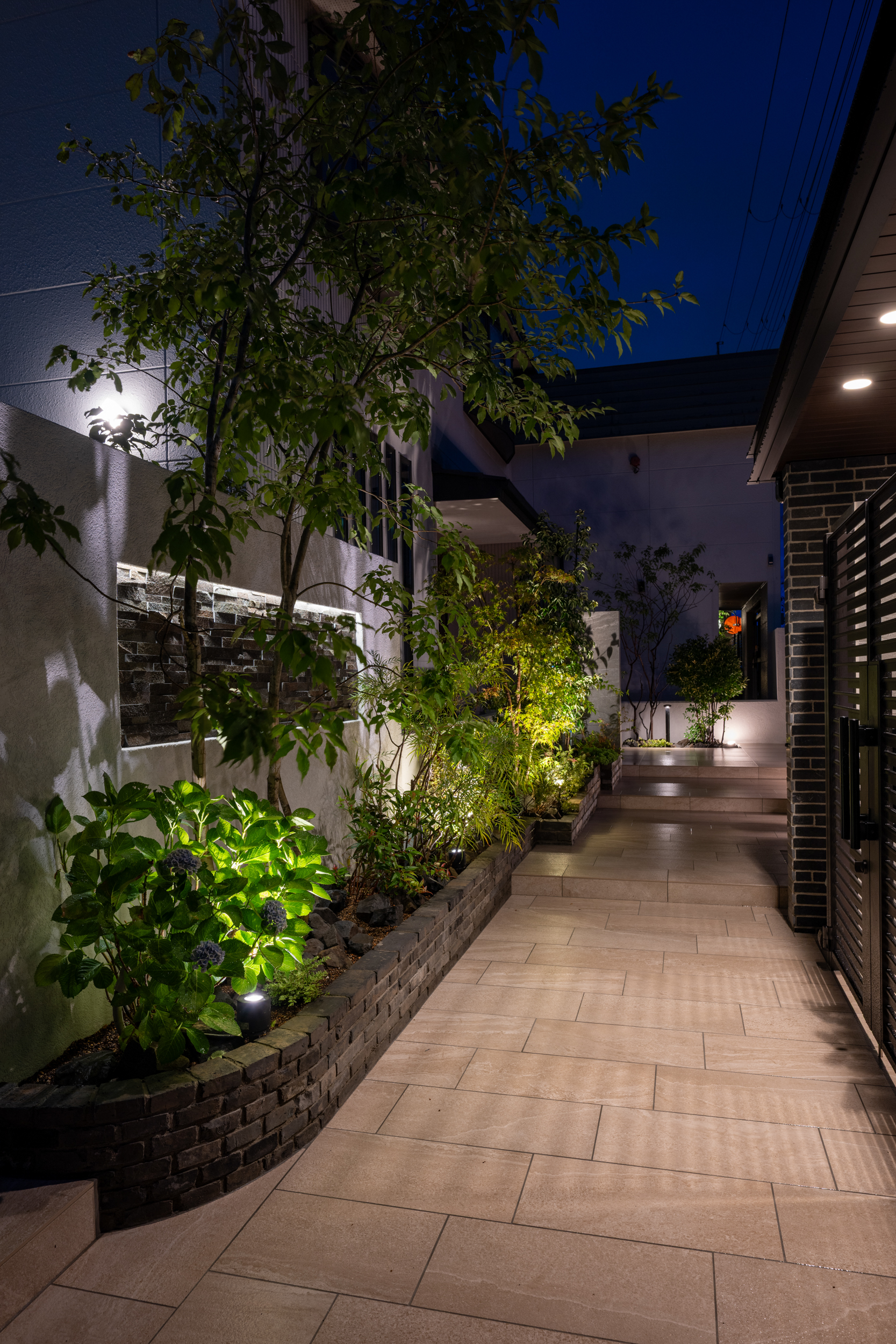アプローチ沿いには足元をやさしく照らすポールライトやスポットライトを配置し、歩行時の安全性を確保しながら植栽の美しさを引き立てています。
