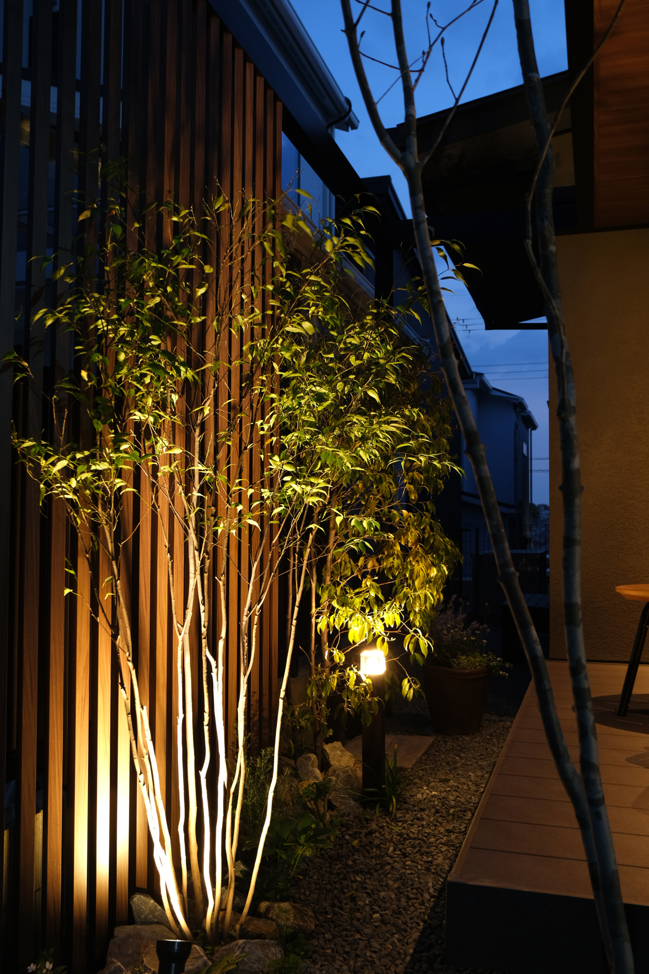 格子と植栽、そして照明が魅せるお庭ならではの演出