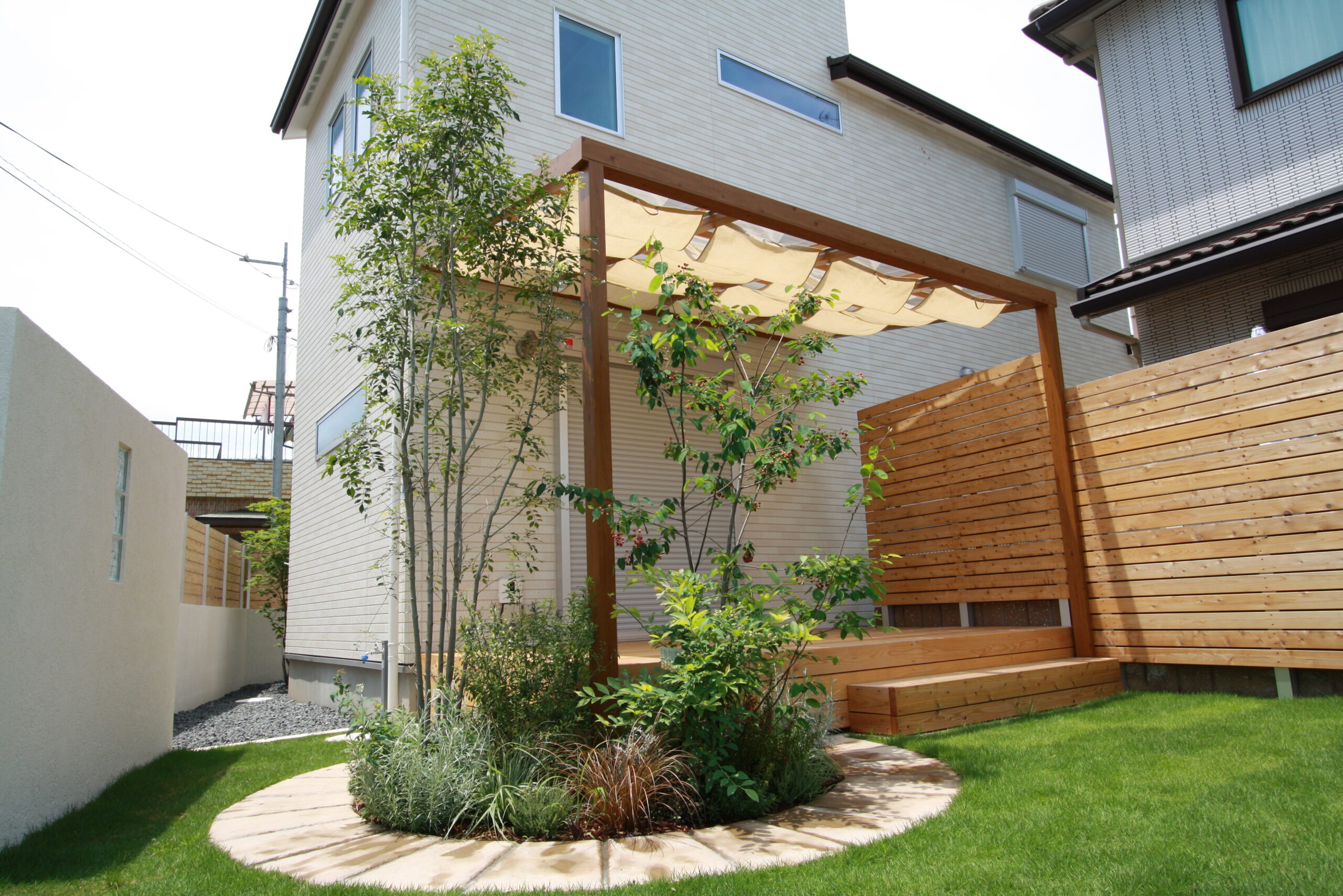 Takasho ポーチテラスを設置 ウッドデッキと目隠しフェンスは天然木